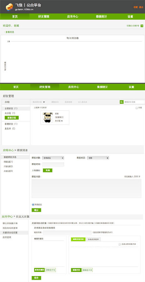 现在看到微信公众平台起来了,又搞个飞信的公众平台,说实话作为正常人我真的想象不出中移动那些人脑子装的都是些什么东西?那么大个中移动找不出几个像样的UX吗?整个界面活脱脱一个山寨版的微信公众平台后台,如下图: